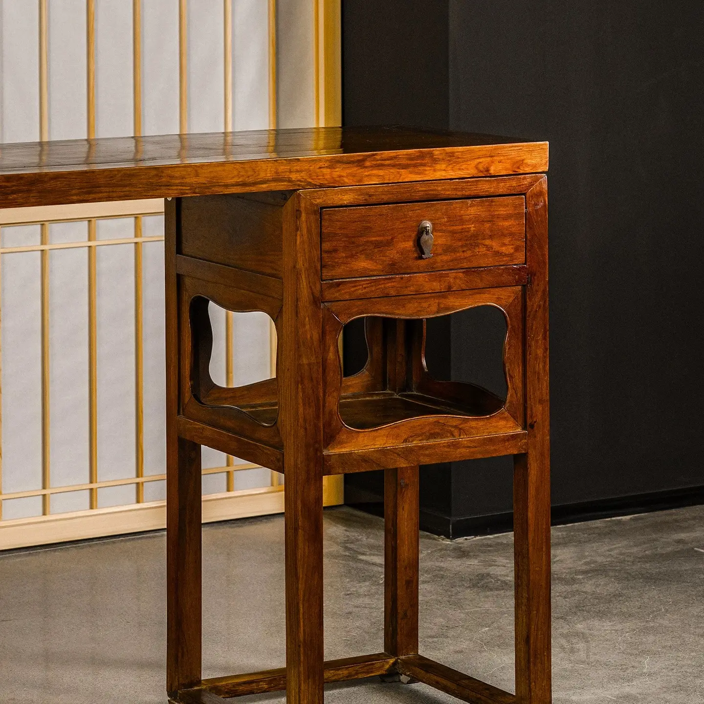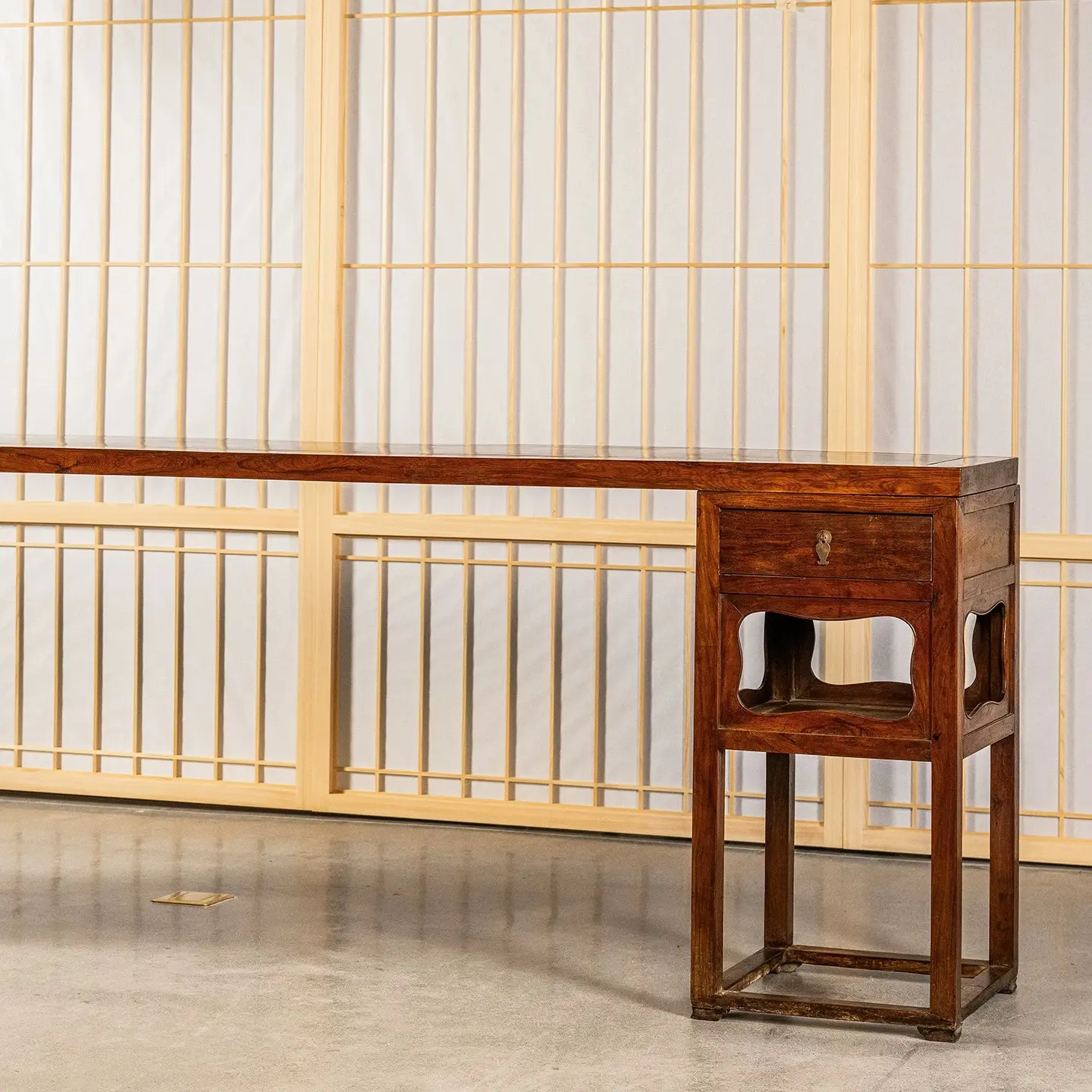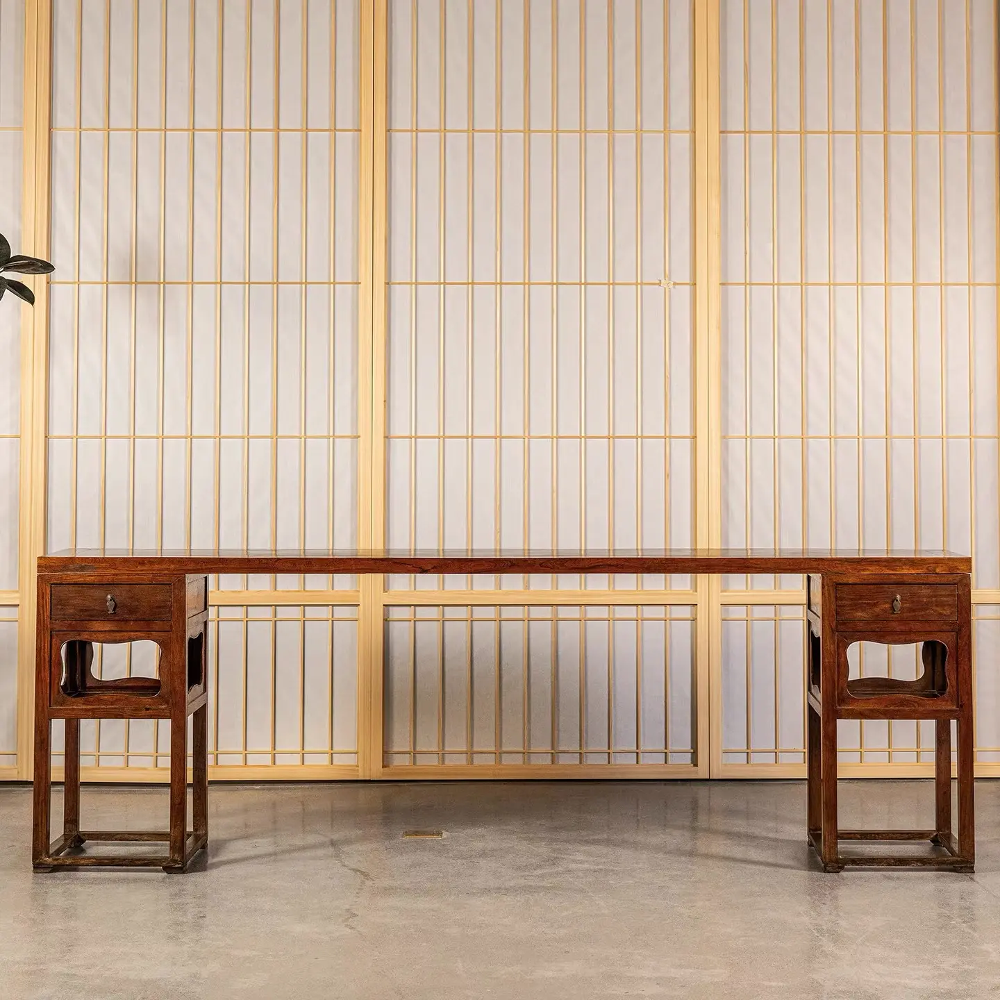 此架几案,气势恢宏,长逾两米六,宽逾四十公分,实为传世大案中罕有之器。其材取上品海南黄花梨,木色浓郁如琥珀凝光,质地坚密温润,包浆幽泽如玉,宝光内蕴,尽显硬木天然贵气。案面攒框镶独板为经典的“一块玉”做法,选料豪阔精严,板幅宏大,尽显物力之奢。板面纹理舒展磅礴,山水云涛奔腾跌宕,大直纹贯通如飞瀑悬川,波磔隐现间尽显天然木理之瑰奇,粲然若画。案面之下承双几为基,几架与案面虽为分体,却气韵相连。架几四面平直,线条整饬如砥,棱角峻拔分明,结构刚健利落,四足劲挺若松立危崖。腿足间上部各有抽屉一具,配以小巧吊牌。抽屉下方更施一层隔板,四周设有海棠形圈口,边缘波磔灵动如浪,恰为通身劲直之骨注入婉约生机。