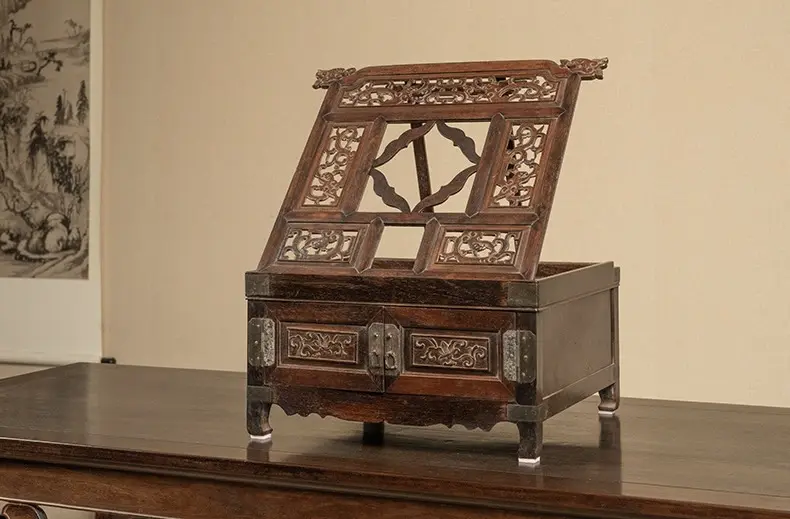 本器以红木制成,浓郁的红褐色与黑色木纹交融缠绕,呈典雅之风,又因结构稳固而不沉于浮华,反而显示出雅正的气质,在书斋等静谧空间中悠然独立。